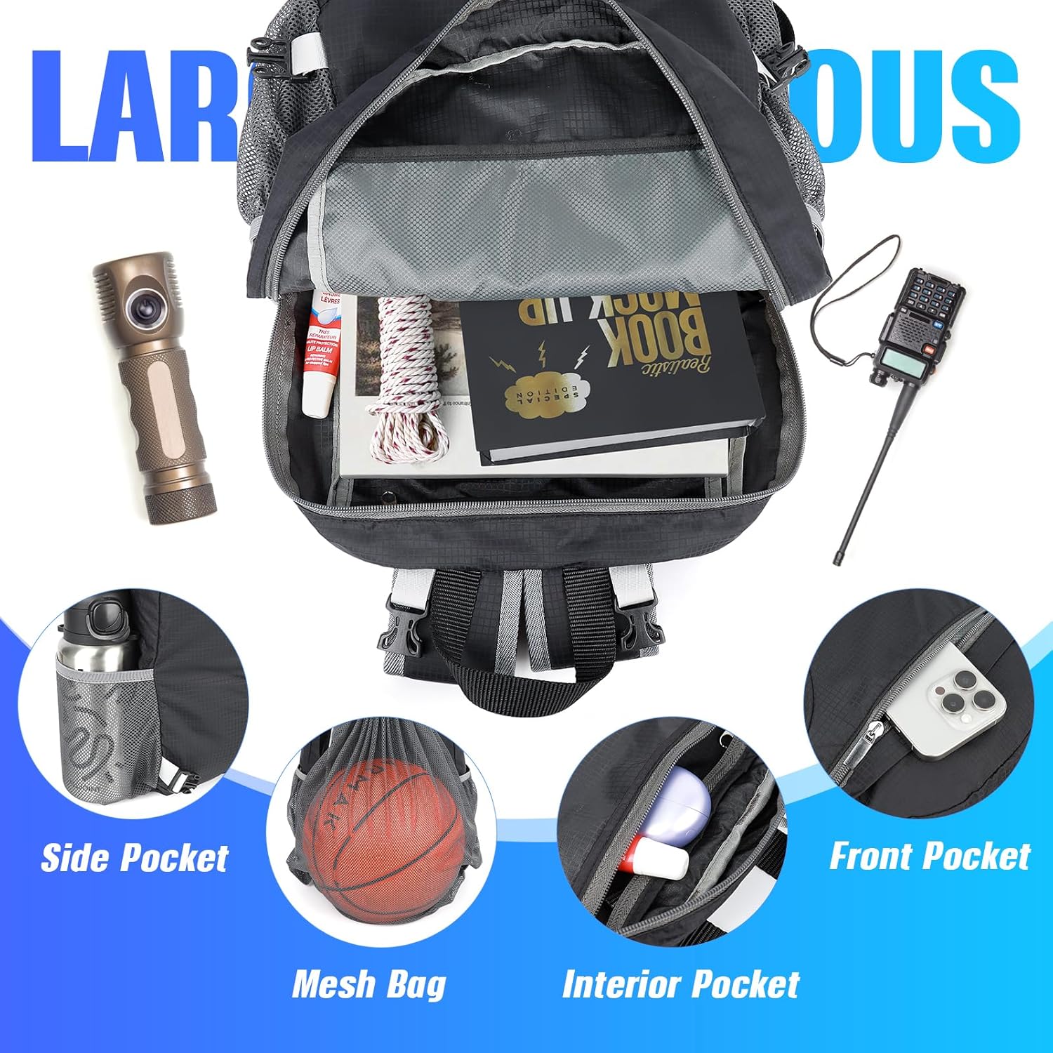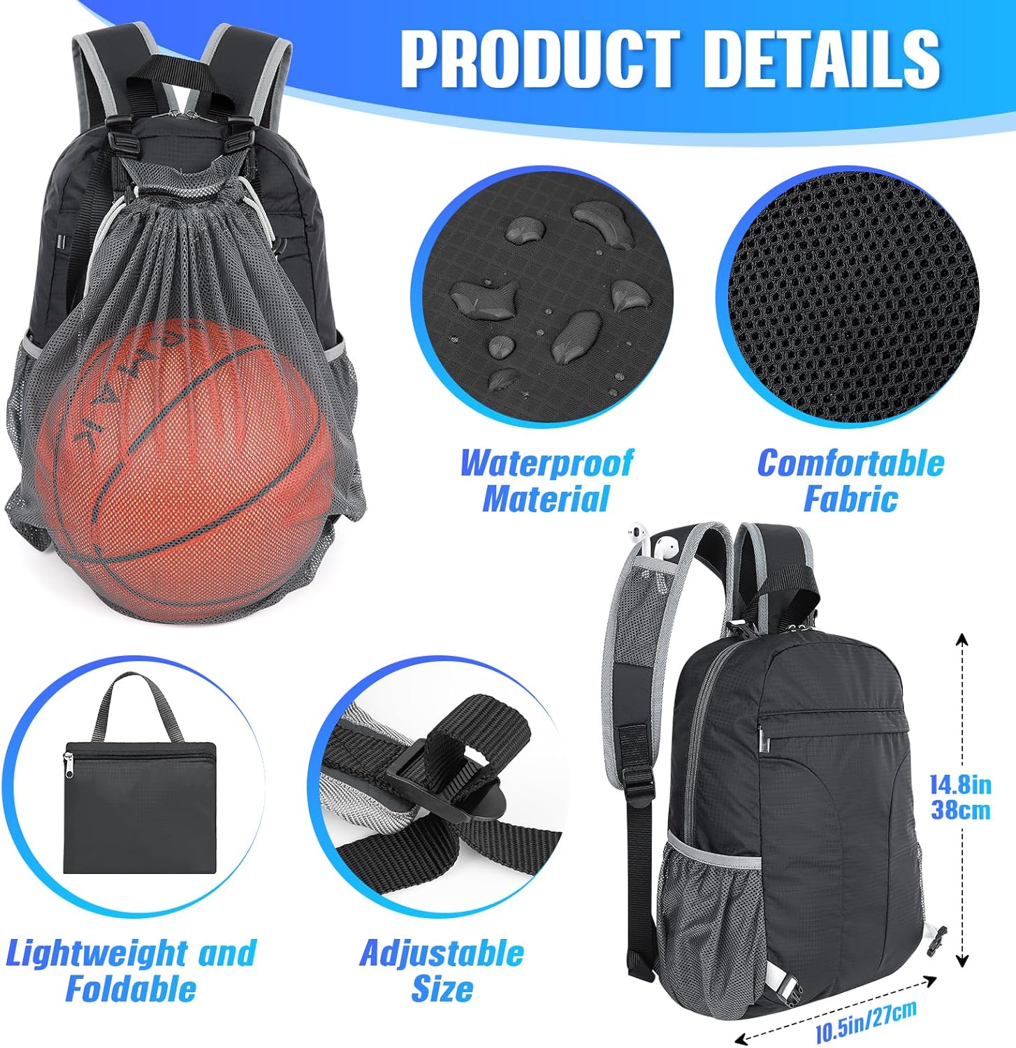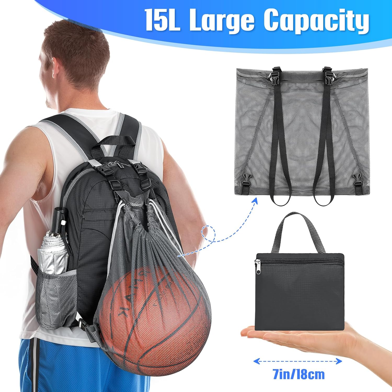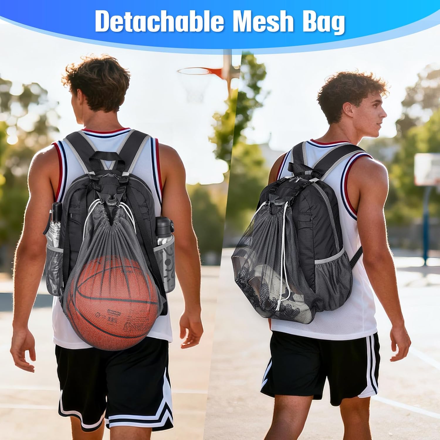 - Detachable Mesh Pocket: Features a detachable mesh pocket with quick-release buckles, perfect for full-sized sports gear such as basketballs, soccer balls, or shoes.